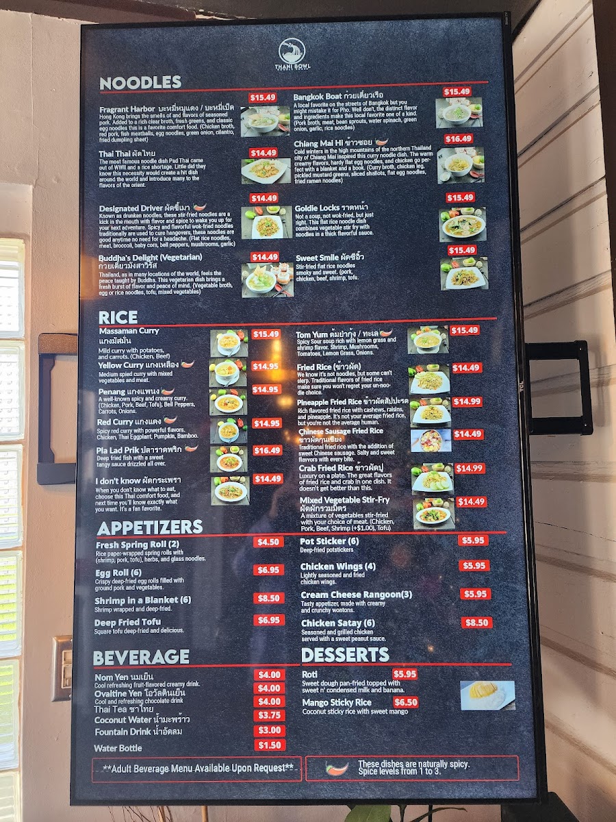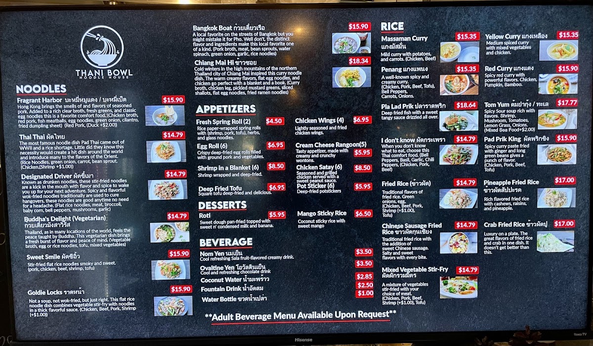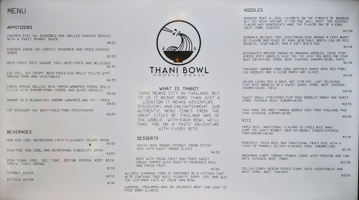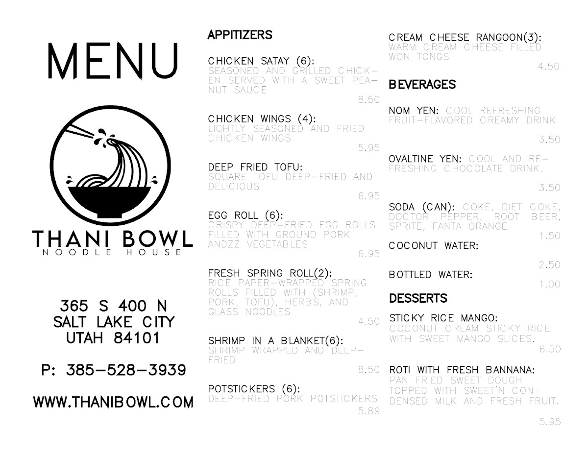 When you step into Thani Bowl Noodle House, you're in for a delightful experience filled with rich flavors and comforting dishes. The Thani Bowl Noodle House Menu offers a vibrant selection of traditional and creative noodle dishes that cater to every taste. From savory broths to stir-fried delights, each dish is thoughtfully crafted using the freshest ingredients. Whether you're craving something light and fresh or hearty and filling, the menu has something to satisfy your cravings. If you're in the mood for a bowl of noodles with bold, flavorful toppings or a side dish to complement your meal, you'll find plenty of options to explore. With every bite, you'll taste the perfect blend of textures and spices that make each dish stand out. It's the perfect spot for noodle lovers looking to enjoy a satisfying, delicious meal in a warm, welcoming atmosphere.